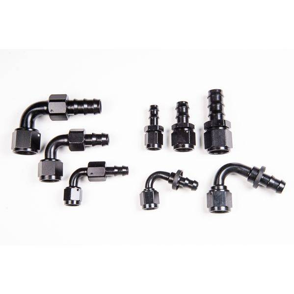 Reusable black anodized aluminum Push-Lok hose ends.