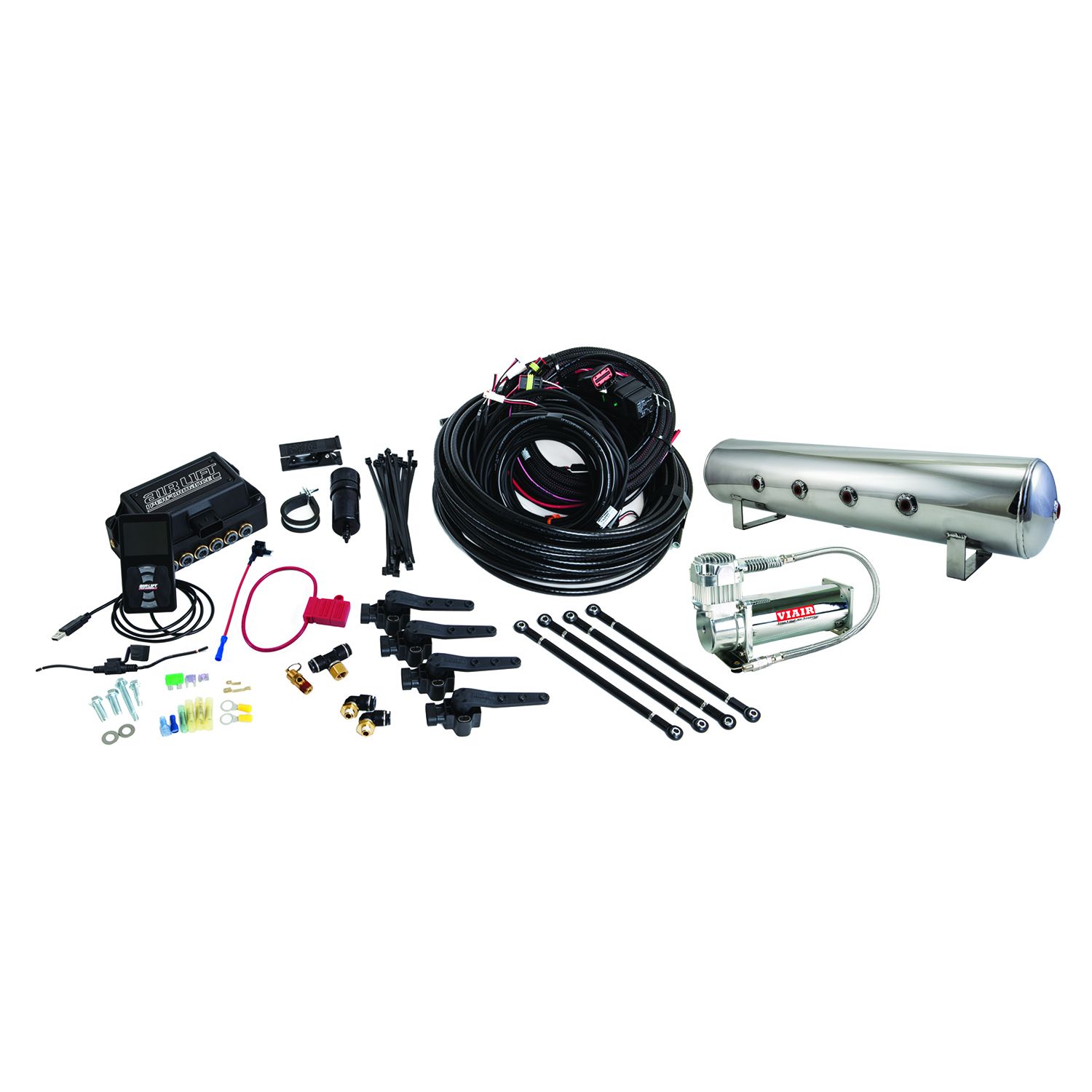 Air Lift Performance 3H .25in Air Line, 4 Gallon 7-Port Lightweight Polished Aluminum Tank, VIAIR 444C Compressor