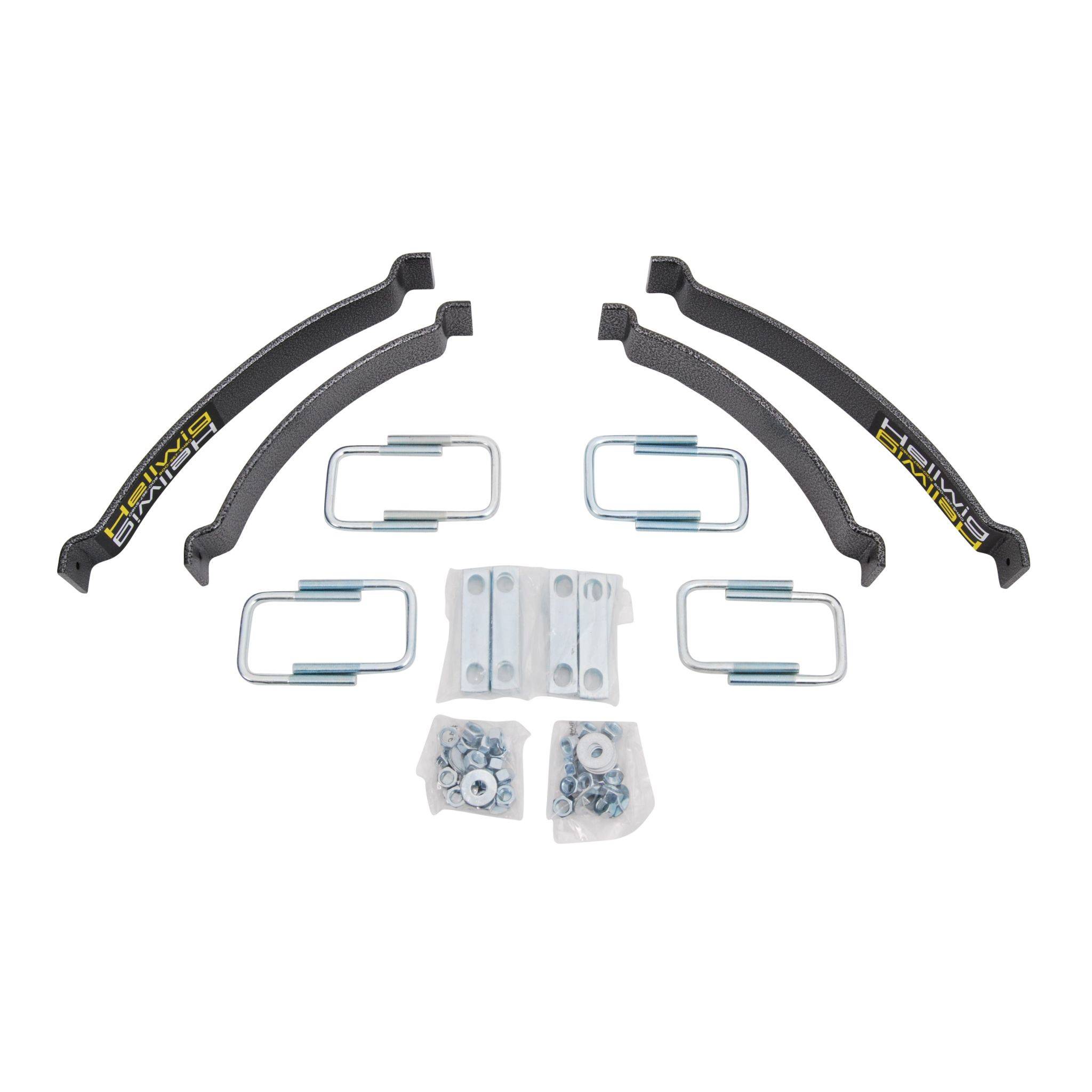 Hellwig’s medium-duty EZ-1000 Helper Springs pack a lot of capability in every box. Packaged complete with the same heavy duty powder coated and plated components, hardware and installation instructions as our heavy duty helper spring products, these kits are designed for the vehicles that need lighter assistance in carrying a load. The simple bolt on design using common hand tools provide the installer ease of installation and the vehicle owner hassle free use. Ideally suited for light towing and loads, these units are fully adjustable using the heavy duty U-bolts included in the kit using simple hand tools. If your tow and haul needs change, simply adjust the U-bolts to suit the new load requirements. Once installed and adjusted you are free to haul or tow with greater control and stability. Manufactured with heat treated ASTM 5160 alloy spring steel in our California based facility, these units are rated up to 1,000 lb. level load carrying capacity. They are a great cost effective spring solution and can be adjusted independently for uneven side to side loads.