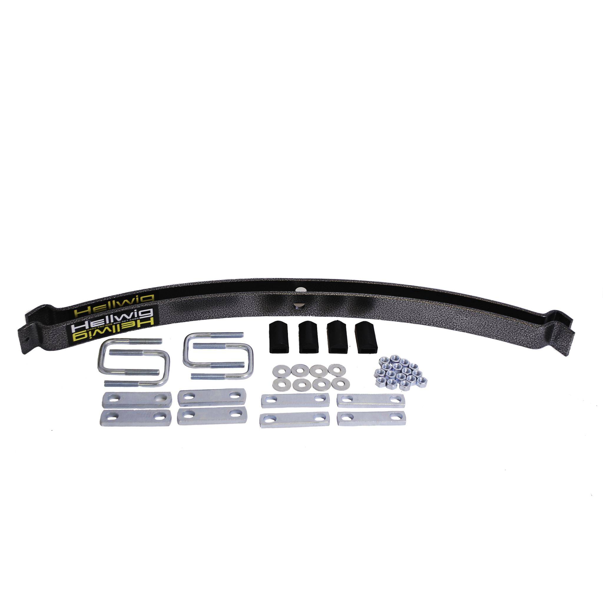 Hellwig’s medium-duty EZ-990 Helper Springs pack a lot of capability in every box. Packaged complete with the same heavy duty powder coated and plated components, hardware and installation instructions as our heavy duty helper spring products, these kits are designed for the vehicles that need lighter assistance in carrying a load. The simple bolt on design using common hand tools provide the installer ease of installation and the vehicle owner hassle free use. Ideally suited for light towing and loads, these units are fully adjustable using the heavy duty U-bolts included in the kit using simple hand tools. If your tow and haul needs change, simply adjust the U-bolts to suit the new load requirements. Once installed and adjusted you are free to haul or tow with greater control and stability. Manufactured with heat treated ASTM 5160 alloy spring steel in our California based facility, these units are rated up to 2,000 lb. level load carrying capacity. They are a great cost effective spring solution and can be adjusted independently for uneven side to side loads.
