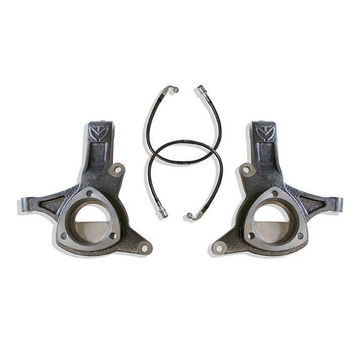 MAXTRAC SUSPENSION’S PART# 701345 IS A PAIR OF 4.5" LIFT SPINDLES W/ EXTENDED BRAKE LINES MADE FROM DUCTILE STEEL & E-COATED BLACK